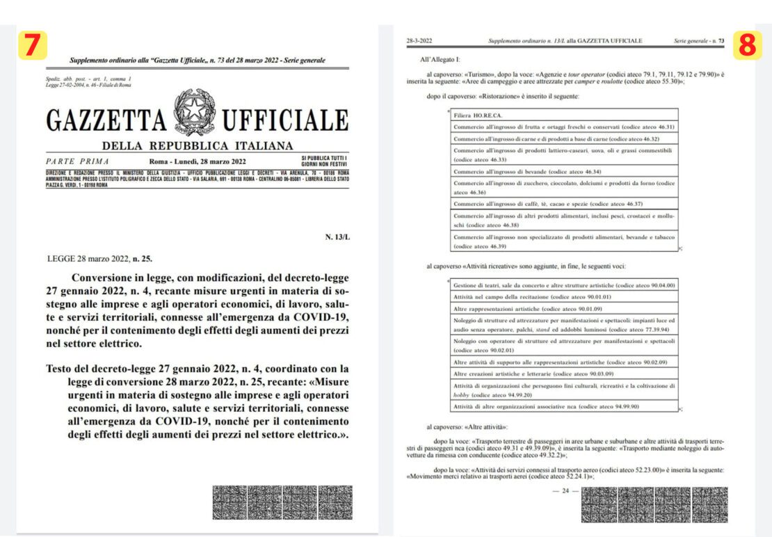 6)     In data 28 marzo viene pubblicata in Gazzetta ufficiale la legge di conversione del DL 4/22 recante nell’allegato all’articolo 7 proprio il riferimento alla filiera horeca con annessi codici ateco di riferimento, come destinataria dell’esonero previsto appunto dall’articolo 7. (punto 7 e 8)